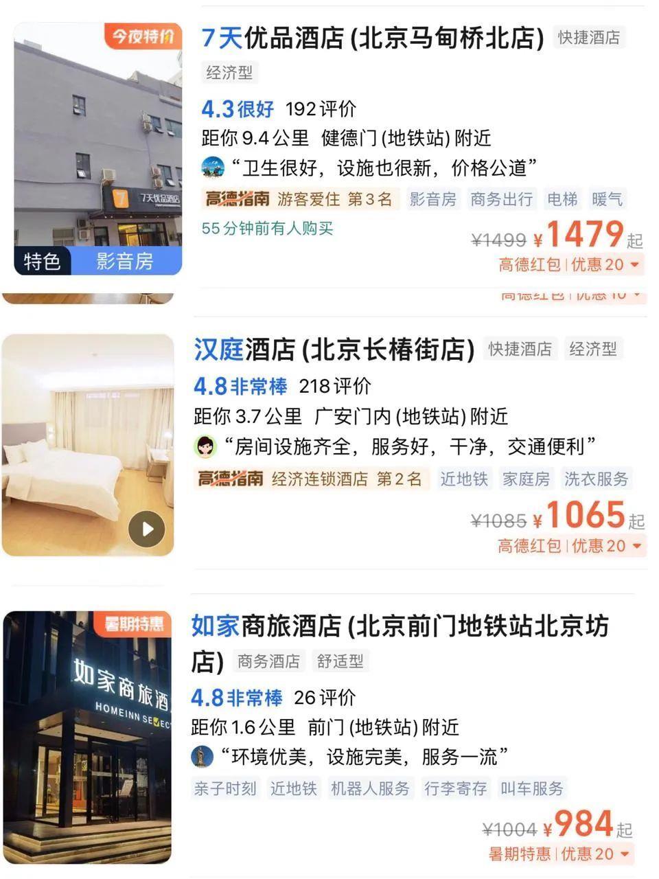在北京其他热门商圈景点附近同样如此,如家、汉庭、全季一晚的住宿费用普遍在500元以上,长椿街的汉庭工作日住一晚甚至要1065元,马甸桥7天优品甚至干到了1479元,而首钢园的香格里拉一晚也才1347元。
