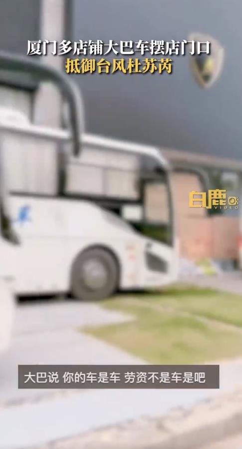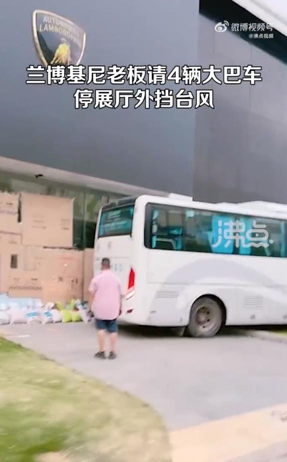 视频显示,不止兰博基尼门店门口停放着大巴车,不少店家都将大巴车摆放在店门口抵御台风杜苏芮。