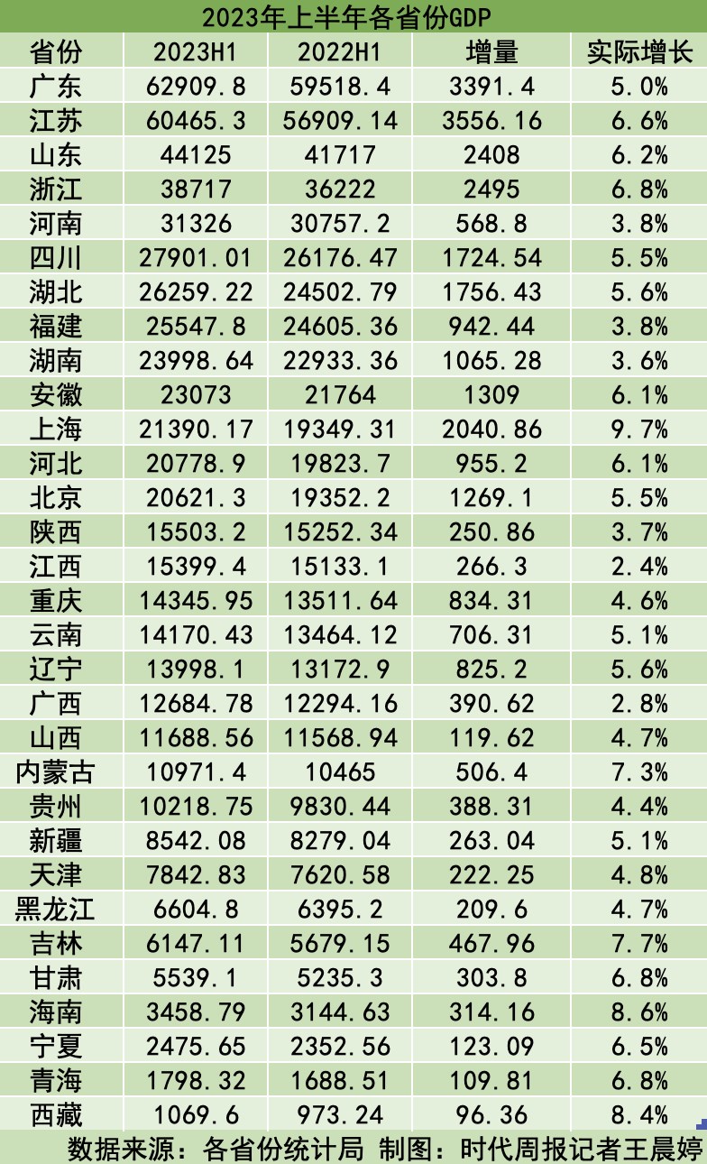 至此,31个省份均已公布上半年经济数据。前6名省份位次未有变化,广东、江苏、山东、浙江、河南、四川6个经济大省挑起“稳增长”大梁。