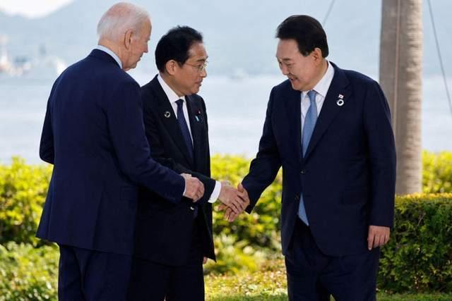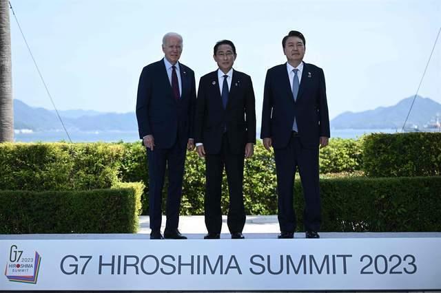 今年5月,美日韩三国首脑在七国集团广岛峰会上。图源:《韩国时报》