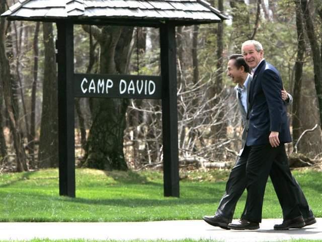 2008年时任韩国总统李明博与时任美国总统小布什在戴维营。