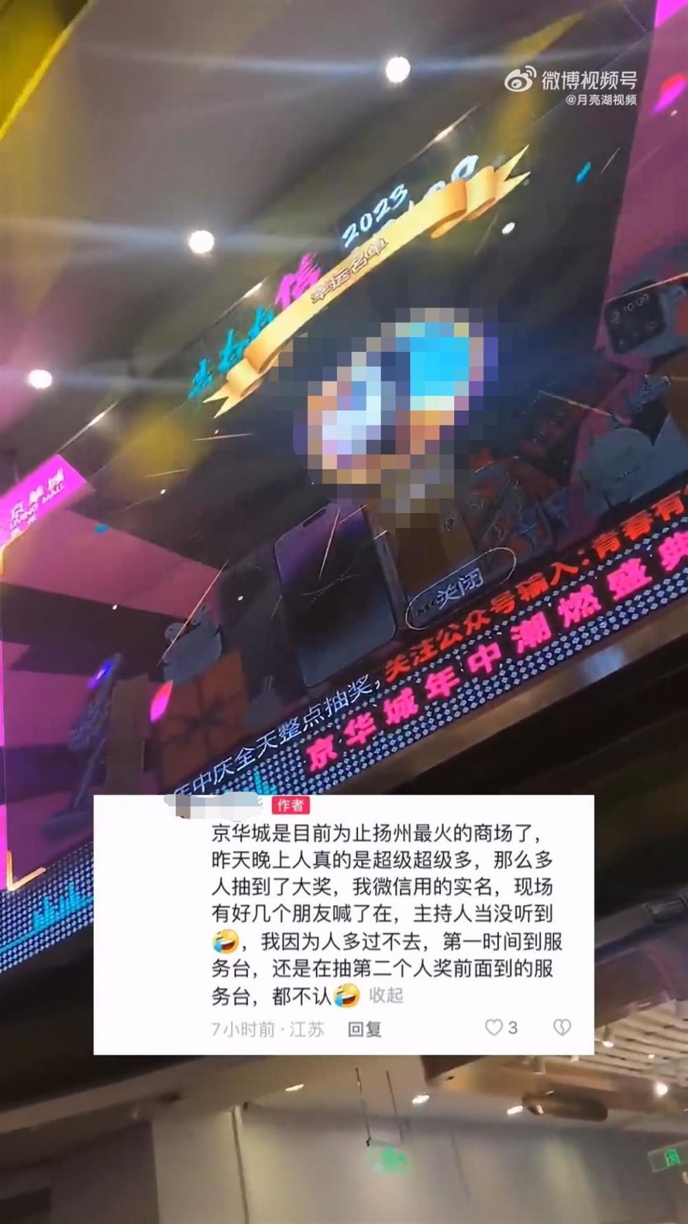 7月29日,一名网友发视频称,她在扬州京华城抽奖活动中用微信实名账号抽中10克金条,但现场人多,她在楼上没来得及赶到抽奖现场,主持人随后宣布弃奖。她赶到商场服务台后也没有拿到奖品。