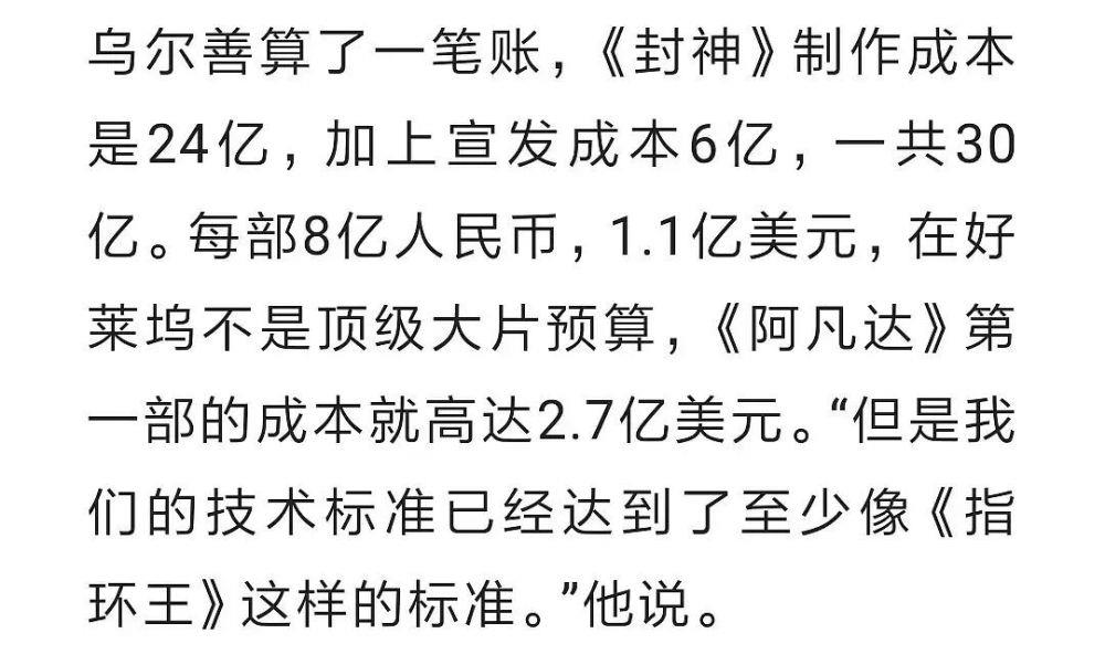 导演乌尔善算过一笔账,《封神》三部曲制作成本 宣发成本初期预算高达30亿,虽然意外遭遇资金链断裂,但实际花费仍然不少,属实下了血本。