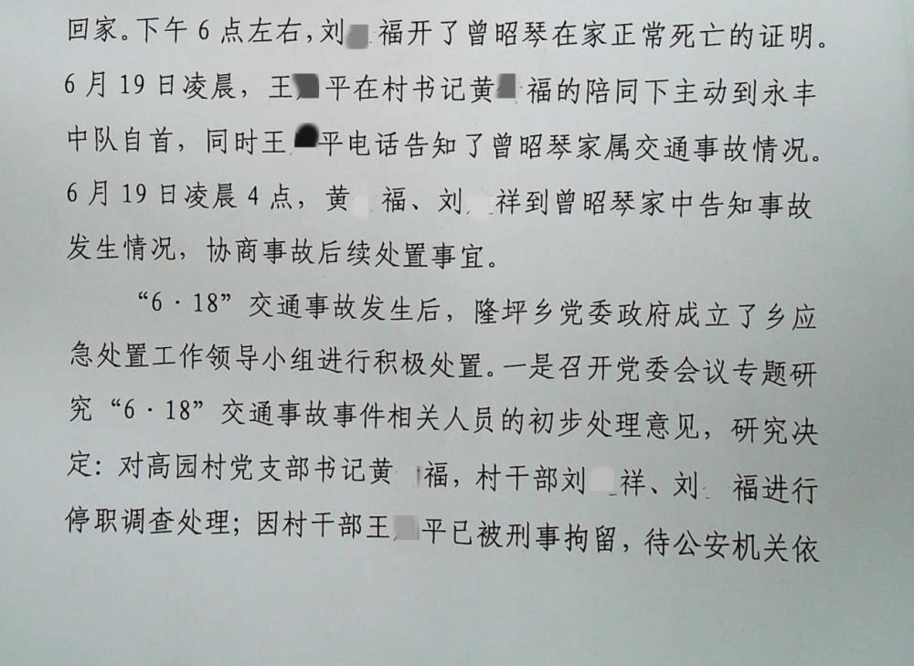 经查,6月18日下午3点10分,高园村村干部王某平驾驶乡干部邱某民的车子,行至高园村三江口交叉路口时撞到曾昭琴。约20秒后,黄某(高园村村支书黄某福之子)驾驶一辆白色轿车经过事故现场,车上还坐有4名乡干部陈某辉、邱某民、王某艳、吕某,其中黄某、邱某民下车查看情况,1分钟后,高园村村干部刘某福也骑摩托车到达现场。