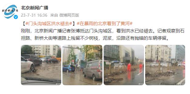 刚刚,北京新闻广播记者张博抵达门头沟城区,看到洪水已经褪去。记者观察到石担路、新桥大街等道路上残留不少树枝,泥浆,沿路还有抛锚的车辆停留。