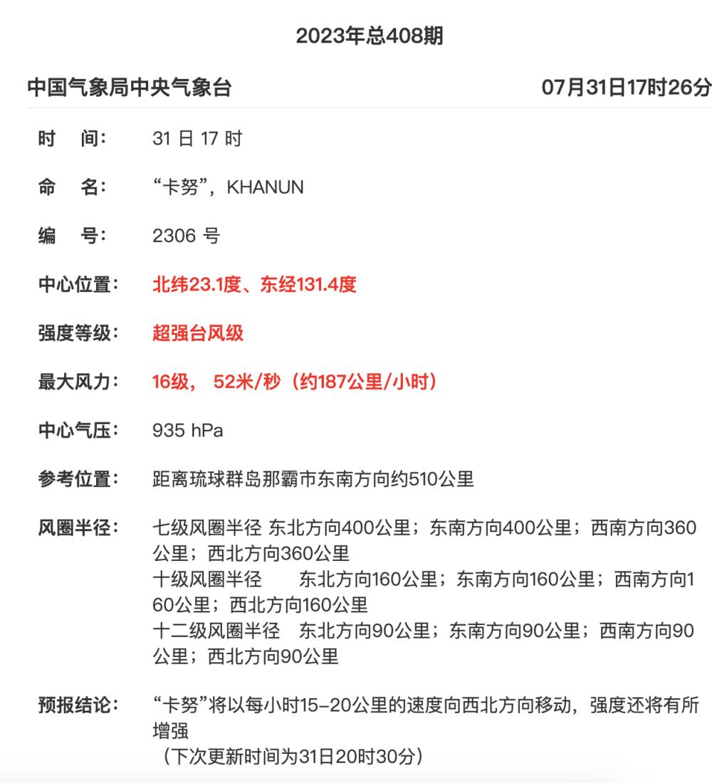 @中国天气 微博消息,台风“卡努”已加强为超强台风。今天“卡努”已连升两级,从台风升级为强台风,再加强为超强台风。从卫星云图上看,其台风眼区清晰,周围云系紧密,结构对称。