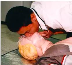 第三步:人工呼吸(在有条件情况使用呼吸面膜、口罩等进行隔离)。
