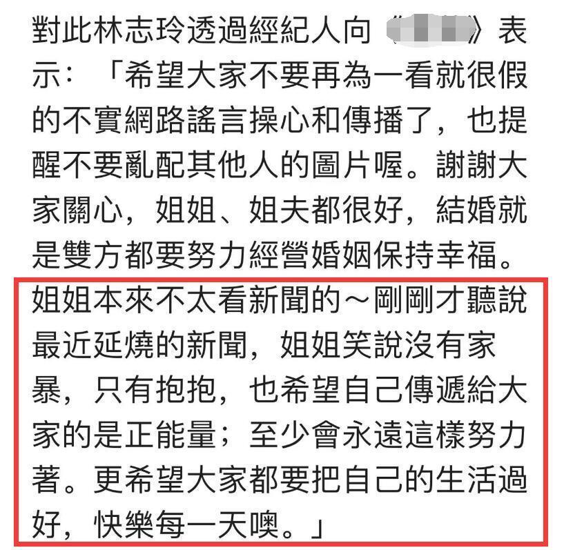 同时经纪人还说,姐姐(林志玲)本来不太看新闻的,刚刚听说最近延烧的新闻,她并未生气只是笑说没有家暴,只有抱抱,也希望自己传递给大家的是正能量,至少会永远这样努力着,更希望大家都要把自己的生活过好,快乐每一天。