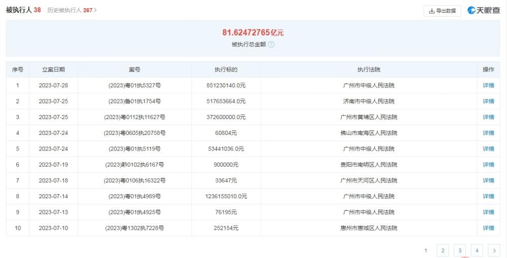 具体来看,执行法院分别是济南市中级人民法院、广州市黄埔区人民法院、广州市中级人民法院,执行标的分别是517653663元、372600000元、851230116元。