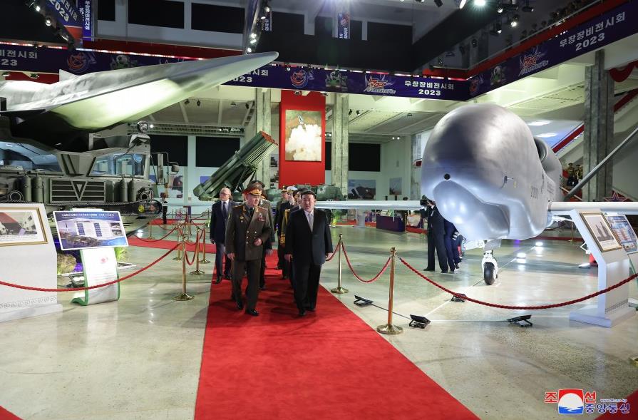 朝中社公布的金正恩与绍伊古一同参观武器装备展览会照片中出现的“新星”-4无人机。