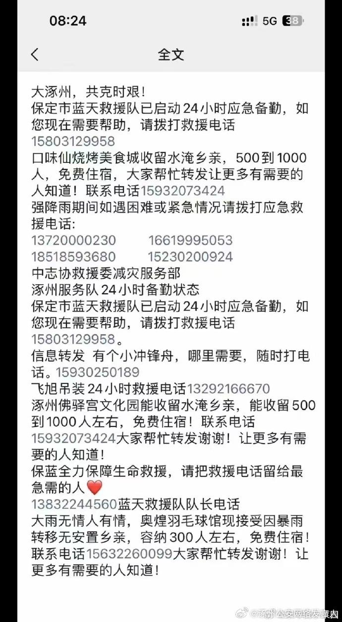 涿州目前需要大量的船只转移群众。全域停水,部分停电,物资供应暂时满足,但不知道能支撑多久。目前高速路畅通,涿州口可以下道,城东问题不大,城西淹得较重。船只(最好有大一点的木船、铁皮船)、皮筏艇、救生衣、纯净水都需要支持。